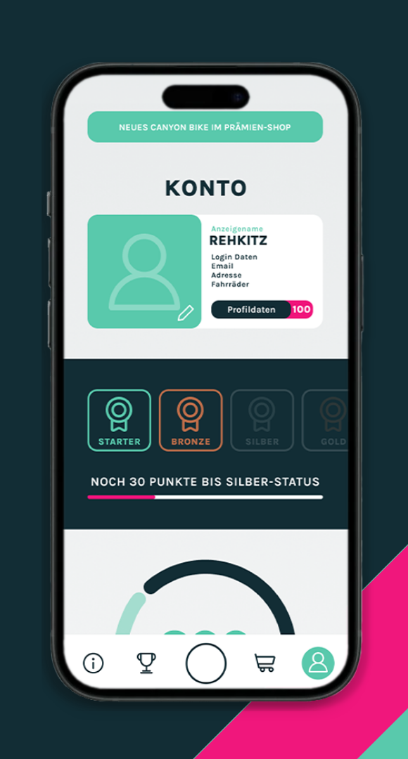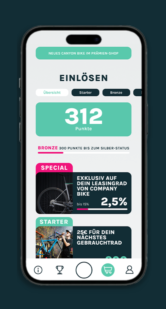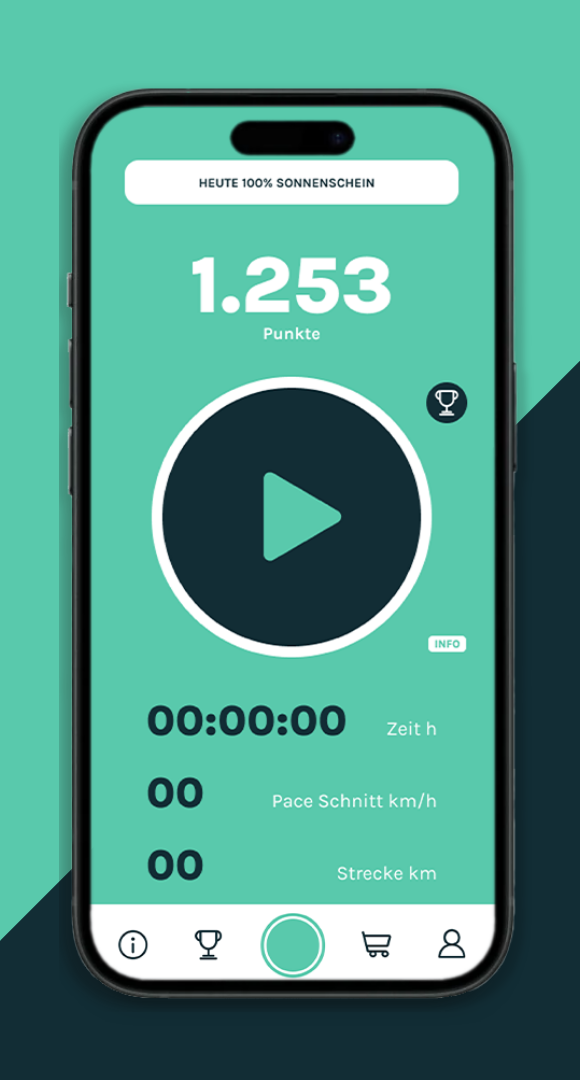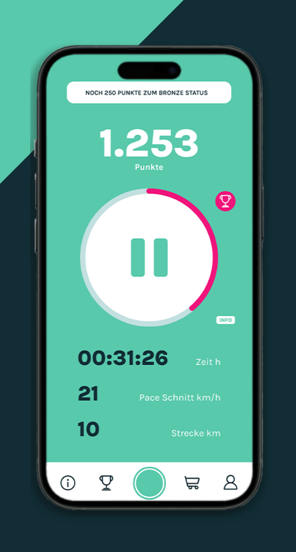 Das Grundprinzip der App besteht darin, mit dem Fahrrad zurückgelegte Kilometer zu tracken und dabei Punkte zu sammeln. 1 Kilometer entspricht einem Punkt. Darüber hinaus kannst Du zusätzliche Punkte z.B. über Challenges, News oder Interaktionen in der App sammeln.